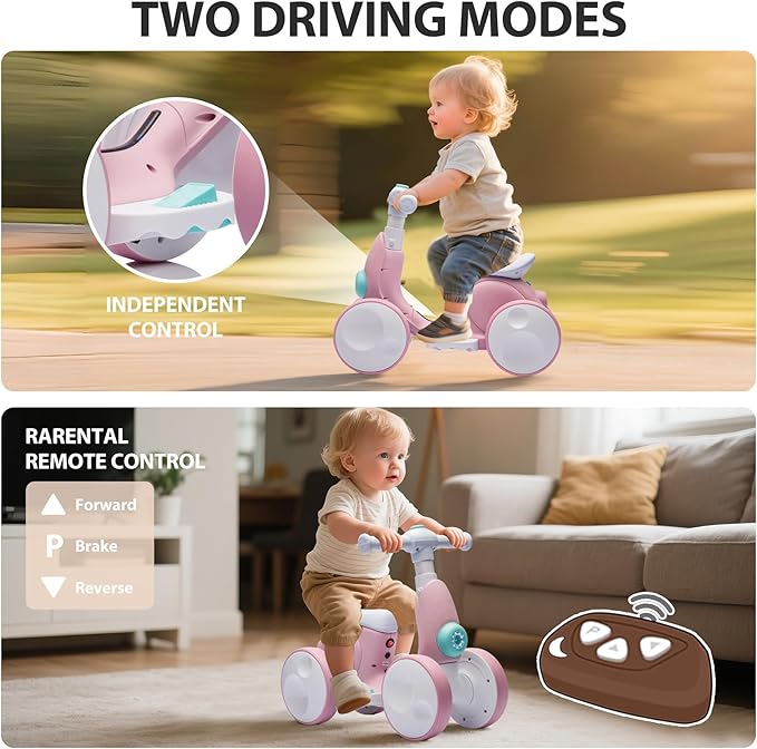 - Electric Baby Balance Bike - Step on the pedal of the electric balance Bike. The electric propulsion mode allows kids to enjoy a true driving experience. There are two different control modes. Children enjoy independent driving in the "Child Mode", while parents use the included remote control to control the "Parent Control mode". This is fun-filled and safe journey
