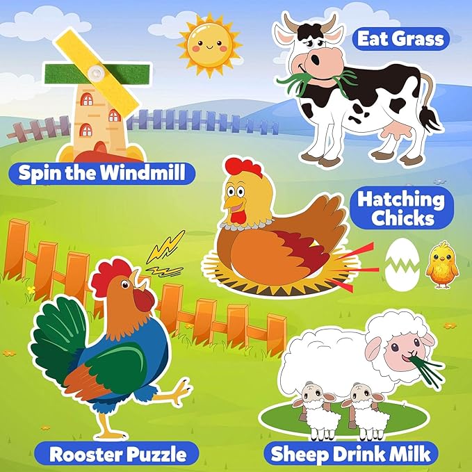 - Develop Cognitive & Sensory: The baby busy book adopts the Montessori educational method. Explore a world of shapes, colors, farm animals, fruits, vegetables. With interactive features like finger toys, spinning windmills, feed the cows grass engage sensory development and cognitive skills.