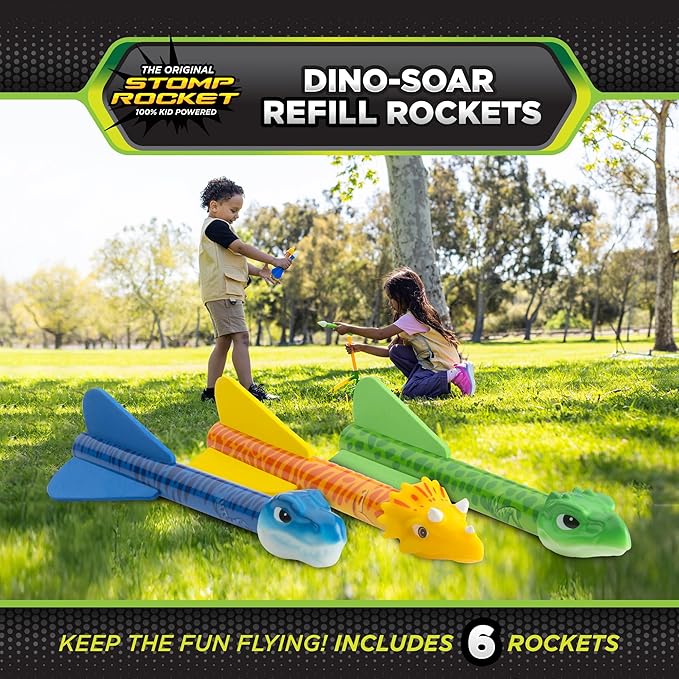 - KEEP THE FUN FLYING: Maintain the thrill with Stomp Rocket’s Dino-Soar Rocket Refills. Replace lost or damaged rockets and keep the good times rolling with friends and family! Includes 6 Dino-Soar rockets. Recommended for ages 3 and up.