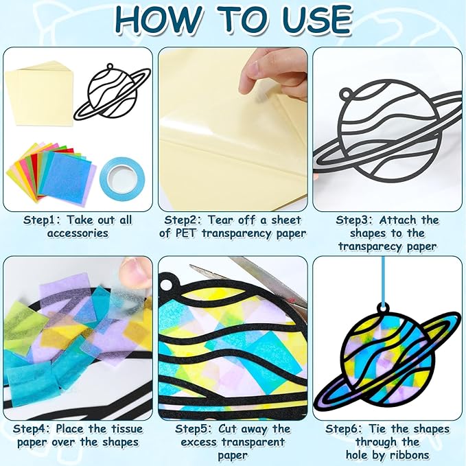 - Easy to operate: Trim the tissue paper to your desired shapes, peel off the backing from the PVC sheet, and apply the template. Stick the colorful tissue paper on top and trim the excess PVC along the edges. The pre-cut hole makes it easy to hang your outer space tissue paper arts crafts on wall, door, or window with the ribbons. This DIY space window suncatcher crafts for kids will bring a pop of color and joy to your space.