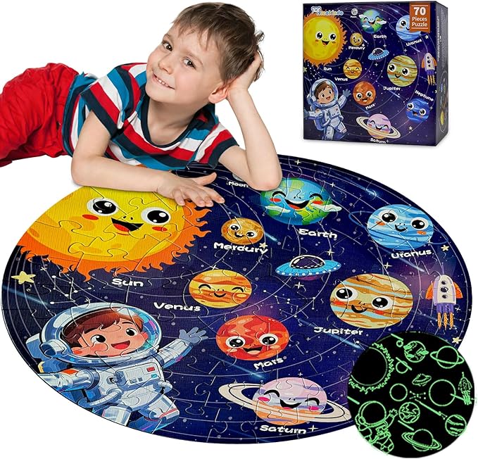 - Glow-in-the-Dark Space Adventure: The kids puzzles glows in the dark, adding extra fun. Simply expose it to light, and at night, planets and orbits will emit a soft glow, making kids feel as if they are in the vast universe.