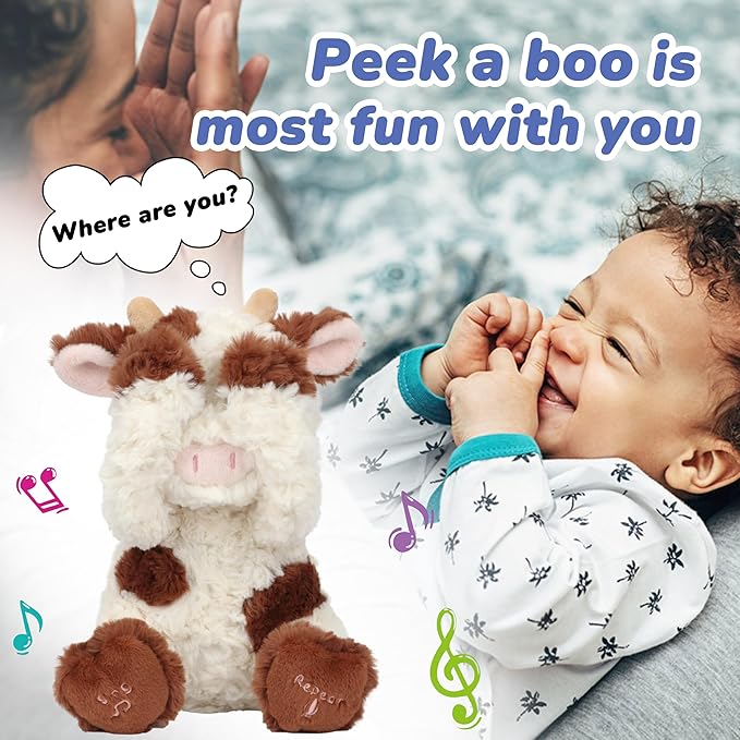 - ADORABLE FIGURE: This animated plush toy is a cute and fuzzy cow. When you press the left button, it will say “Peek-a-Boo” and sing songs, you can press the button to switch (5 songs are concluded). Press the right button, it will repeat what say. Meanwhile it can make adorable Peek-A-Boo hand motions while singing or speaking.