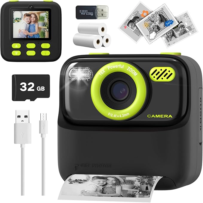 - Portable & Powerful Battery Life: Our kids instant print camera adopts Type-C charging technology thus saving time with faster charge speed. Continuously taking photos for 3-4 hours after fully charged. Come with a 32GB SD card(is already installed in the camera) to store thousands of photos. Also, the camera for kids also specially designed a durable lanyard for portability, easy to carry and move.