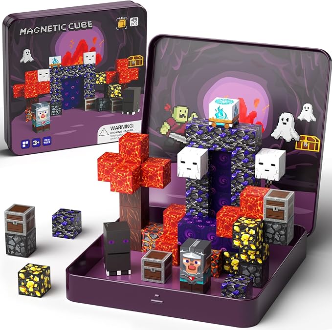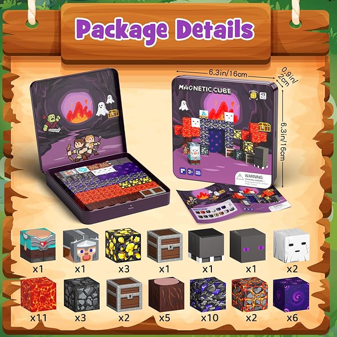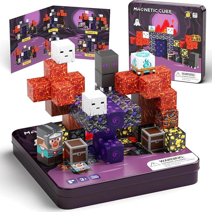 - 【Geme Theme Magnetic Blocks】Dive into a universe of magnetic toys designed for budding builders.Including 49 pcs magnet cubes with a landscape of lava rivers,volcanic ash, our idea booklet is providing storyline and beautiful patterns, kids can either follow our patterns or create with their own imaginations.Explore an exciting adventure!