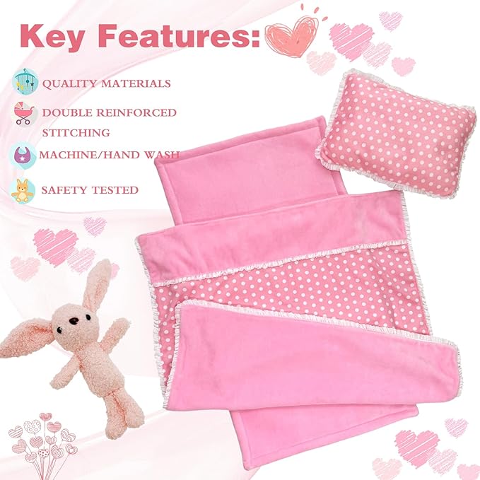Baby Doll Accessories Bedding Set Soft Blanket Mattress Pillow Dolls Playset Fits 16-18 Inches American Doll Furniture Toy Girls and Boys (Pink)