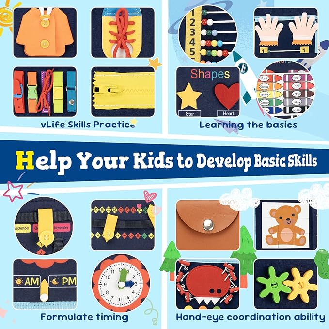 - SAFE AND DURABLE - Our montessori busy board toys is made of safe, non-toxic felt and is the perfect sensory busy board montessori toys for ages 1-4. Thoughtfully designed with larger components and rounded edges, it minimizes the risk of choking or injury. Plus, it's ready to use - pre-installed with hook and loop fasteners so no assembly is required. Enjoy a safe, engaging and carefree way to support your child's sensory exploration and early learning.