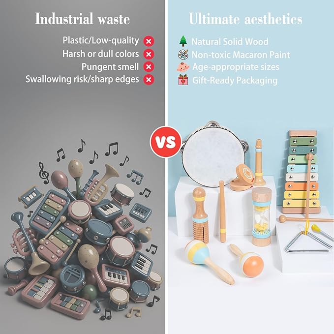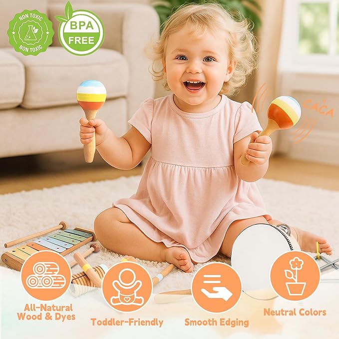 - š¶SAFE & MADE FOR LITTLE HANDS:Crafted from natural wood and non-toxic materials, these wooden musical instruments for toddlers 1-3 are safe, BPA-free, and smooth with no sharp edges. Soft Morandi colors soothe the eyes, and the ergonomic design fits perfectly in little handsāideal montessori toys for 1 year old boys and girls at home or daycare