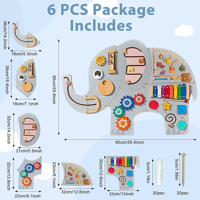 - Complete Set: This elephant wall busy board includes 6 wooden wall panels measuring 13 x 7.8 inch (approx.) with the longest piece—the elephant’s trunk—measuring 14.2 x 6.3 inches. and 20 screws to form a delightful wooden activity wall panel. With a total height of 25.6 inches and width of about 35.4 inches, the playful elephant shape captures kids’ attention and adds a fun decorative touch. Made of quality wood, it’s a secure and durable option for everyday play.