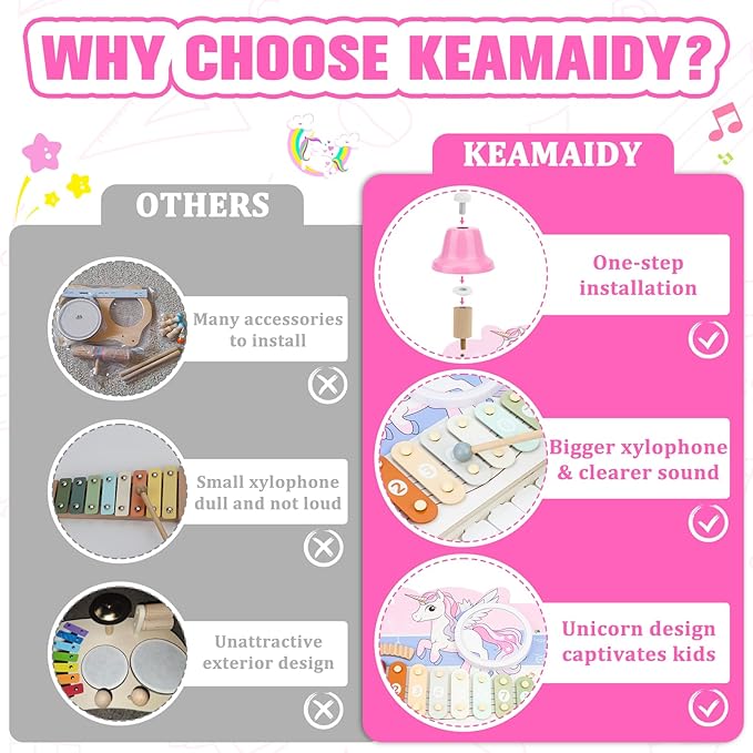 - ✅ 5-in-1 Musical Toy: Piano + drum + xylophone + bell + sound blocks in one compact stand — no loose parts, just endless creative play!