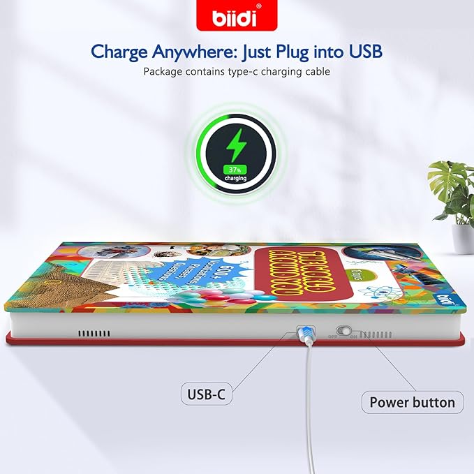 - Durable Design & Type C: Tear-resistant & waterproof book pages, carefully bound.The electronic learning book with rounded corners that are safe. Simple and convenient TYPE-C charging port is more reliable, and up to 6 hours of continuous use at moderate volume!