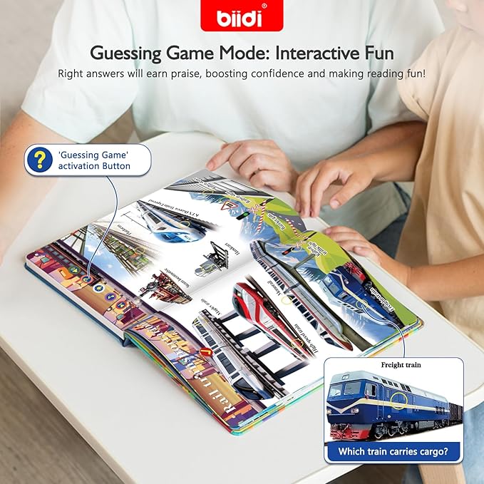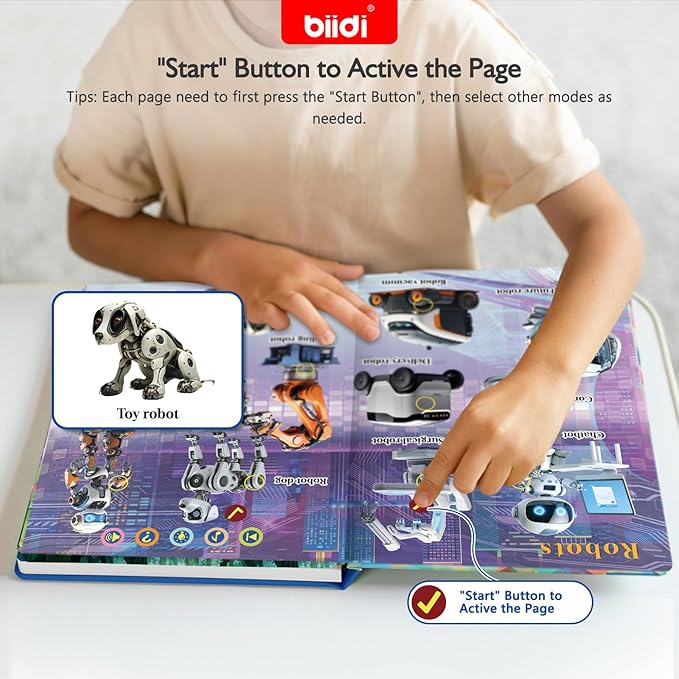 - 4 Smart Modes for Curious Kids : Word Mode (Press the yellow dots to hear sounds words—great for vocabulary!);Learn More Mode: Learn more about the transport and robot ; Guessing Game Mode: Praise for correct answers-boosts confidence!Entertainment Mode:10 super-catchy kids' songs,10 beloved storytime classics, builds rhythm and language skills while they bop.