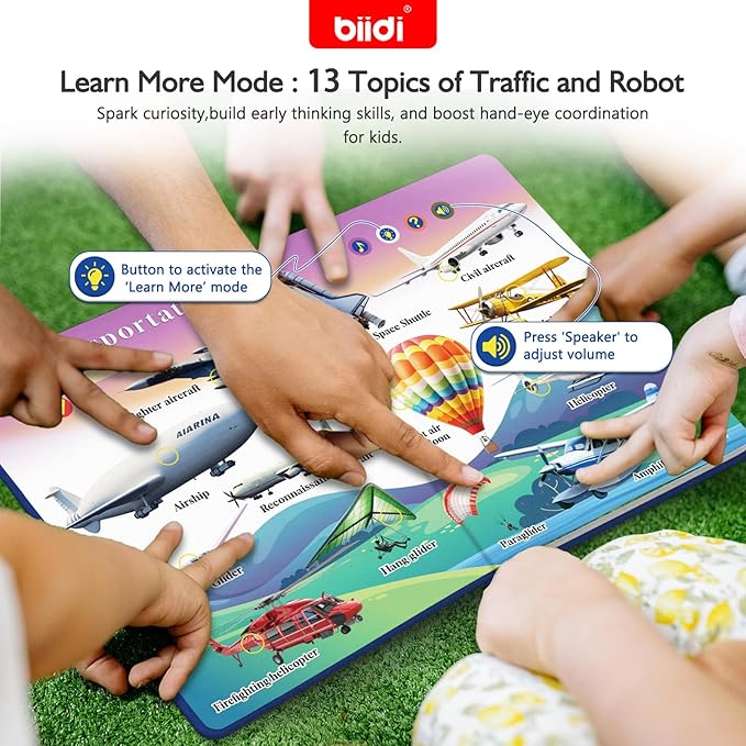 - Rich Content & Highly Entertaining English Talking Book: This activity sound book contains 600+ sounds, such as words, phrases,Interactive games ,songs, stories, etc. Moreover, this interactive audio book has 13 theme about "Traffic and Robot", such as air transportation,Water transportation,Rail transportation,Robot animal,etc.