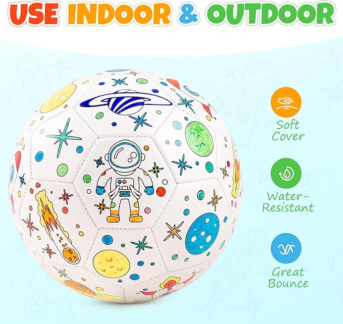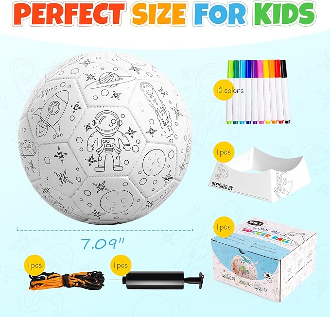 - 【Astronaut-Themed Color-Your-Own Soccer Ball – Spark Creativity & Fun】 Let your child's imagination run wild with this Astronaut-themed color-your-own soccer ball! Designed for young artists and soccer fans, this Size 3 soccer ball features a blank white surface perfect for customizing with the included 10 vibrant markers. Kids can draw astronaut, or even create their own prehistoric designs—making it a unique, personalized sports toy.