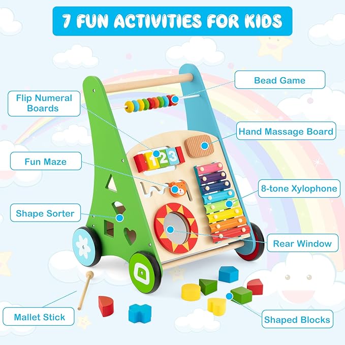 - All-in-1 Utility Design: The HONEY JOY baby push walker provides 7 fun activities for kids. They can enjoy the bead game, flip numeral boards, hand massage board, shape sorter, fun maze, rear window and 8-tone xylophone for various fun. In addition, a mallet stick and 8 shaped blocks are included for convenience.