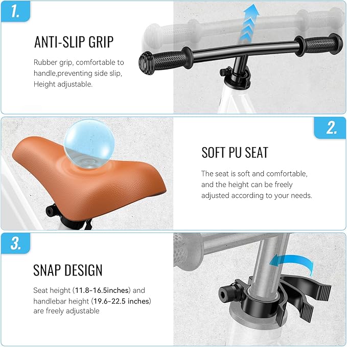 - GROW WITH KIDS- Equipped with quick-release mechanism, parents can adjust the seat height(11.8-16.5inch) and handlebars height(19.6-22.5inch) without tools, easily adjust to the most suitable height for your child.