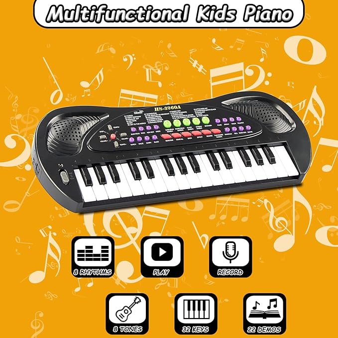 - 【Multifunction 32 Keys Piano】Come and explore the children's musical kingdom. Features include piano playing function + single speaker + ensemble mode + recording and playback function + automatic standby sleep function + 8 tones + 8 rhythms + 22 demo + 4 percussion instruments. Allow children to create their own "mini albums" and unleash their musical potential and boundless imagination