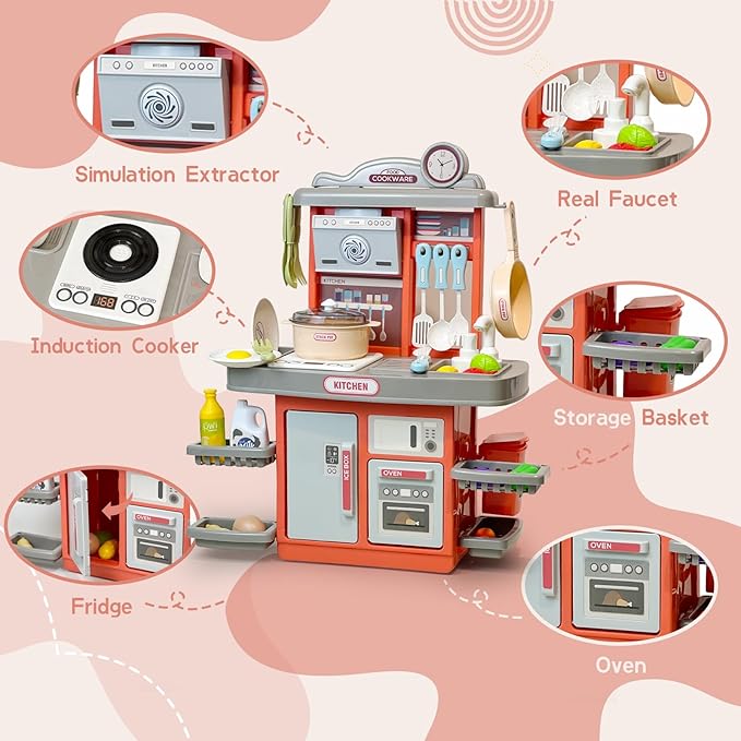 - Cuterabit toys kitchen set includes a kitchen worktop, a play sink that can squirt out running water, a stove with sound and light, play kitchen tools, play cookwares, play food Storage basket and other accessories.