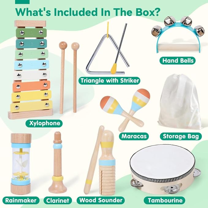 - 8PCS Montessori Musical Instruments Toy for Toddler 1-3: Spark early rhythm & musical discovery with our complete 8-in-1 instrument collection! Designed for little hands, these wooden toys promote fine motor skills, sensory exploration (sight, hearing, touch), and joyful musical learning inspired by Montessori principles.