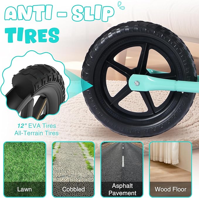 - Adapt to Various Terrains: Suitable for grass, indoor floor, gravel, asphalt road etc., to give baby or children more opportunities to explore. Whether it is a flat community road, or a rugged field trail, this balance bike can easily cope with, accompany the child bravely forward.