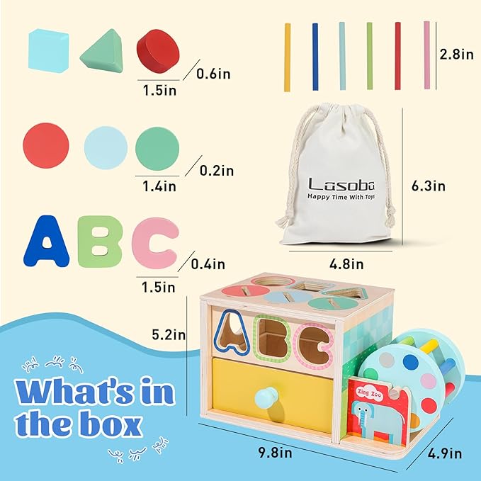 - [5-in-1 Toddler Montessori sorting Toy]: This all-in-one Montessori toy offers 5 engaging games for kids—color & shape sorting, coin drop game, shape sorter, letter matching, and rotating drum. This multifunctional toy keeps little ones entertained for hours, blending fun with discovery in every activity