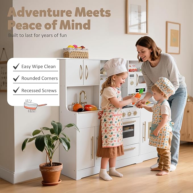 - Storage space: This is a wooden kitchen toy, the play kitchen has plenty of storage space, and each children's kitchen tool has a unique location. It can cultivate children's good storage ability and self-care habits