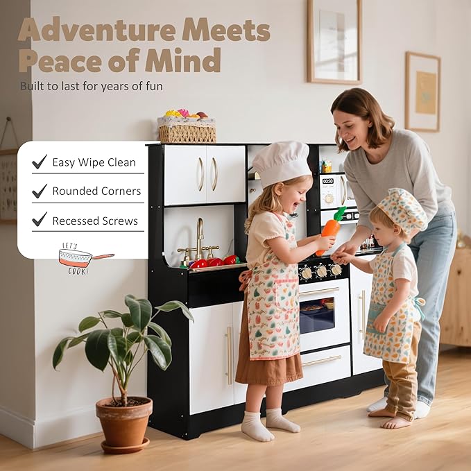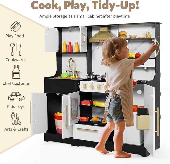 Kids Kitchen Playset, Wooden Play Kitchen with Toy Storage System, Pretend Play Kitchen Set Toy with Range Hood, Ice Maker & Coffee Maker, for Kids Ages 3+, Black