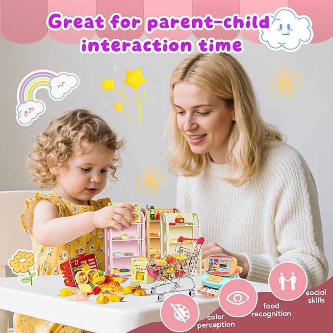- EDUCATIONAL - This Super realistic versatile grocery toy set , suitable for all kinds of gaming occasions, like play house, parent-child games, role plays, pretend plays. These fun games stimulate the imagination of the kids, improve kids calculating ability and will bring children endless possibilities for their futures. Transform your child’s playtime into a miniature world! Role-play as shoppers, cashiers, or store managers to develop communication skills.Practice counting with toy dollars and toddler cash registers change, to build basic math skills.