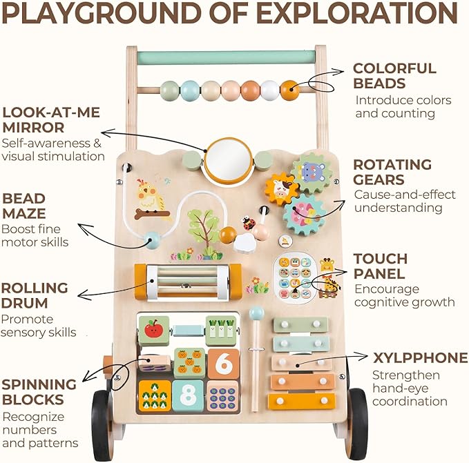 - All-in-One Play & Walk: Features a sensory-rich panel with a mirror, spinning gears, and shape-sorting toys that boost fine motor skills, color recognition, and sensory development. A rear storage rack allows little ones to carry their favorite toys, encouraging emotional comfort and imaginative play on the move