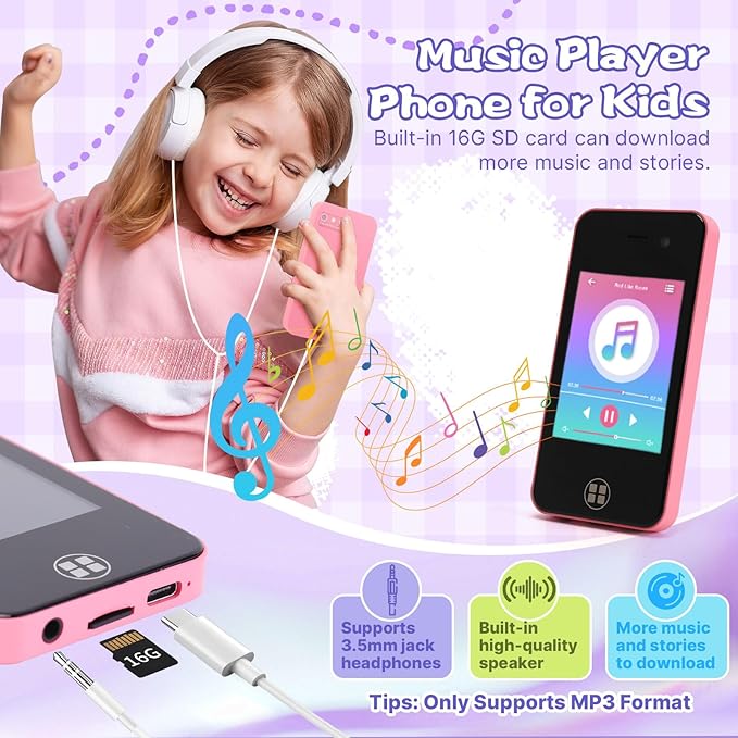 - Drop Protection with MP3 Player: Designed for girls and boys aged 4-8, this learning toy features a durable silicone shell that can withstand accidental drops, ensuring the device lasts longer. The mini phone is equipped with high-quality speakers, supports volume adjustment, and has a 3.5 mm headphone jack, making it ideal for children to listen to music and stories. It includes a 16GB memory card, providing additional space for storing photos and videos. It can also be used to download MP3 songs, stories, and videos.
