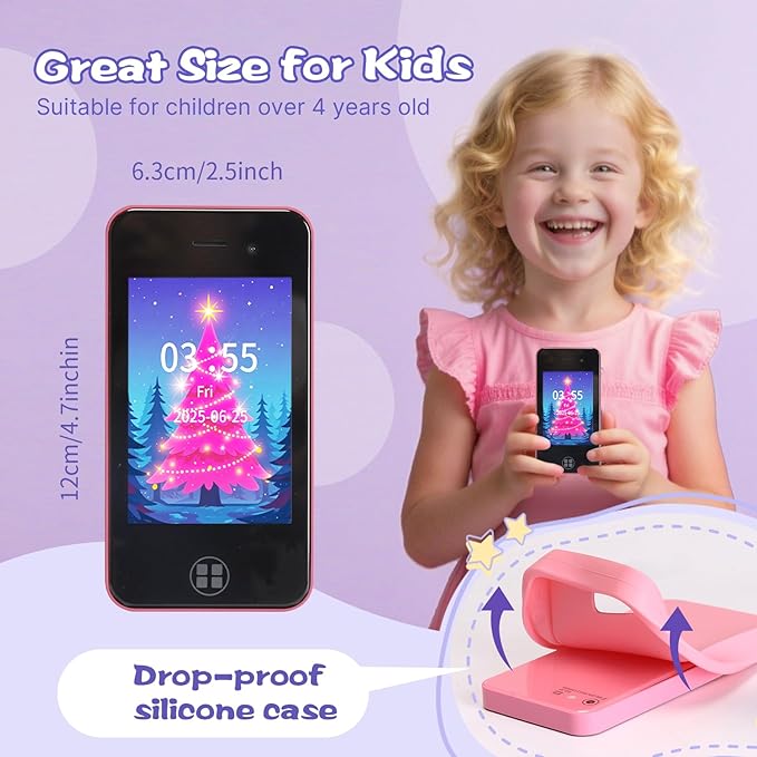 - Multi-functional Kids Toy Phone: The kids’ smartphone is equipped with a 2.8" touchscreen and has a variety of functions, including a dual camera, MP3 player, games, voice recorder, habits tracking, alarm, flashlight, stopwatch, calculator, theme, music, stories, etc. It offers convenience, fun, and a new experience for kids ages 4-12. The pretend cell phone is a good toy loved by kids ages 4-10 years old but also a practical tool for kids' daily life.