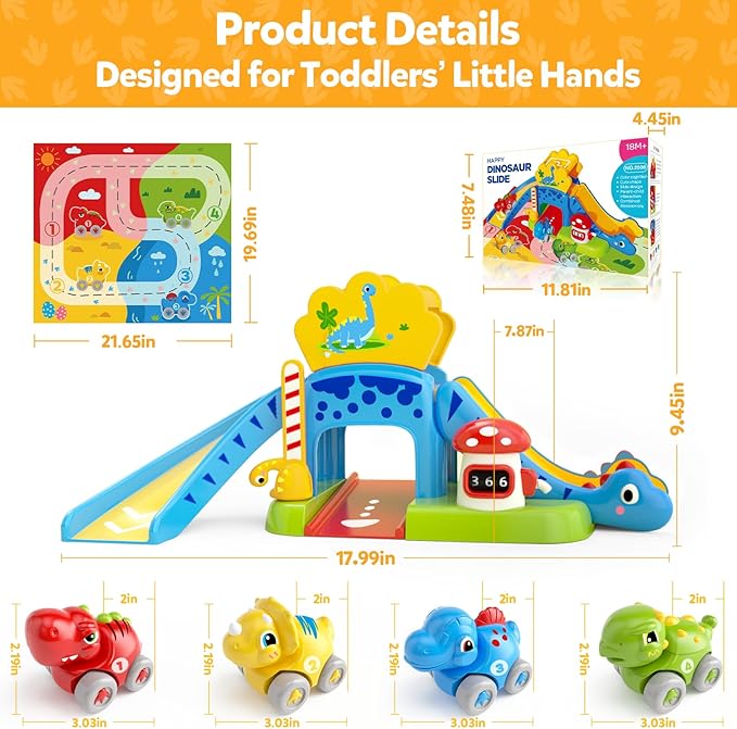 - Fun Dinosaur Slide Set: Perfect toys for boy with 4 colorful dinosaurs and a playmat for endless indoor or outdoor play; Enhances hand-eye coordination and fine motor skills