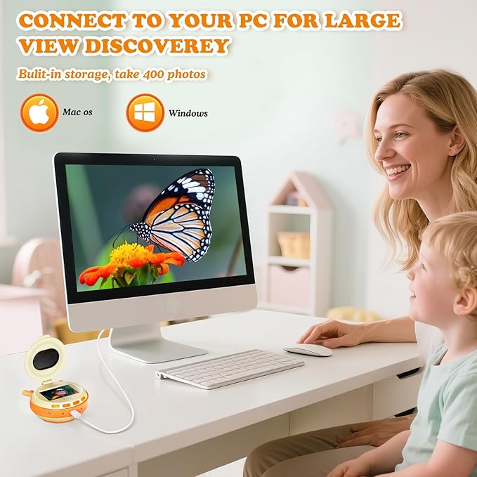 - BUILT-IN STORAGE & PC CONNECTION: Stores up to 400 photos internally without a memory card! Connect to PC/Mac via USB for larger screen viewing. Document and share findings with friends and family to boost confidence and curiosity