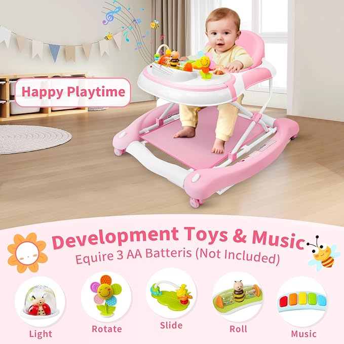 - 【Music and Lights Tray】This baby walker comes with a detachable game tray,including piano keys with melodies and music, twinkle bee, windmill, colorful beaded loop,etc. The game tray can also be used away from the walker. It would help stimulate kids' sense of color, hand-eye coordination and music talent. Requires 3 AA batteries (not included). And after remove the game tray, it can be convertible to a dinner tray. Practical for daily use