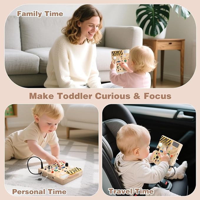 - 【Easy to Carry & Travel Toys】Sized at 7.8″ x 6.5″ x 1.1″, the montessori busy board is easy for your child to grip and carry around, making sensory toys a great companion on the go while traveling. Whether it's soothing a crying baby on a long-haul flight or killing time on a high-speed train or in the car, the busy boards can be a fun companion for your child. In the outdoor park or picnic, the wooden busy board is also a great toy to keep your child focused on playing, adding a sense of relaxation and enjoyment to your trip.