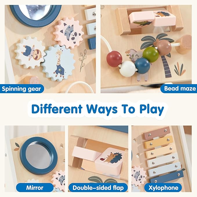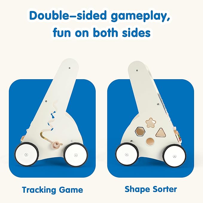 - Walker and activity center: The sturdy wooden frame with non-slip rollers supports baby's learning to walk, and can also be converted into a sensory play station to accompany the baby's growth