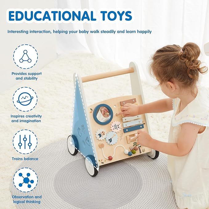 - Multiple educational activities: The baby walker with wheels includes a variety of ways to play, including rotating gears, shape sorters, bead mazes, xylophones, mirrors, and chicken tracking games to stimulate baby's curiosity. Develop fine motor skills and problem-solving skills.
