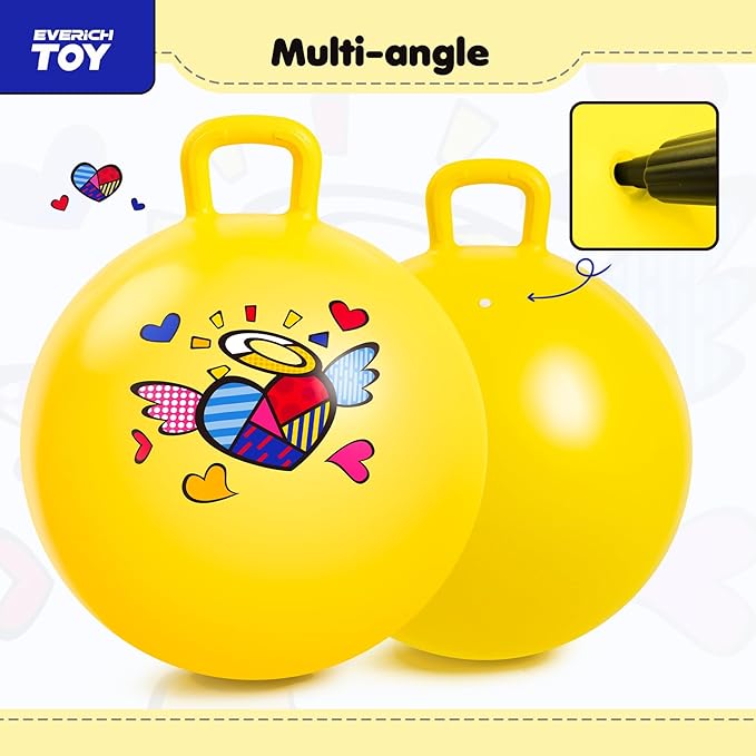 - Vibrant Yellow Hopper Ball for Kids – A fun, stylish outdoor play toys for kids 4+! This 18In bouncing ball with handle for kids features a dreamy yelloe bouncing ball with heart pattern design, perfect for active play. Lightweight yet durable, it comes in multiple sizes to fit different ages. Great for indoor or outdoor play fun—let your child bounce, jump, and giggle for hours!