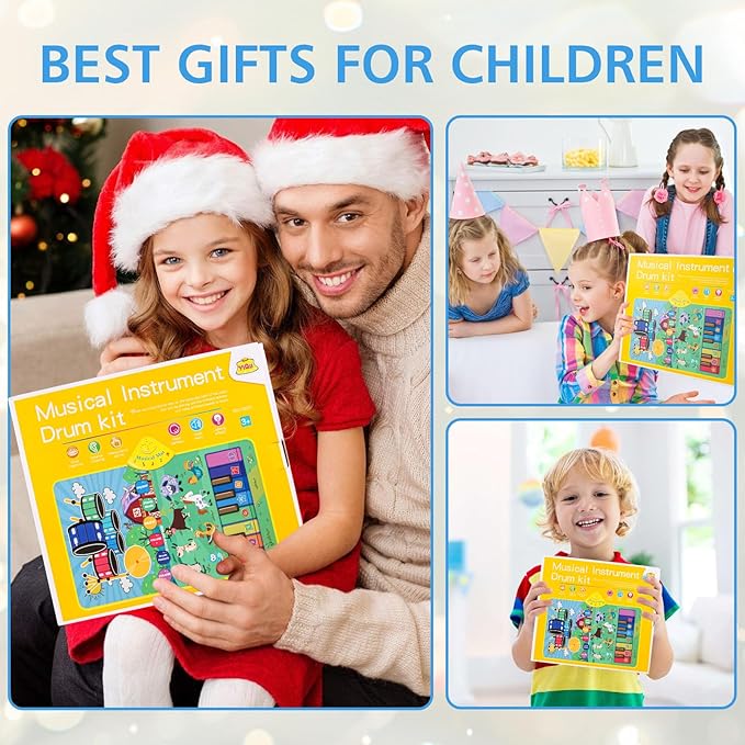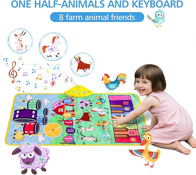 - TRIPLE FUN IN ONE:This music mat combines a realistic drum set, animal sound buttons, and piano keys, allowing kids to switch between playing percussion, identifying animals through sounds, and creating melodies effortlessly, offering diverse entertainment.