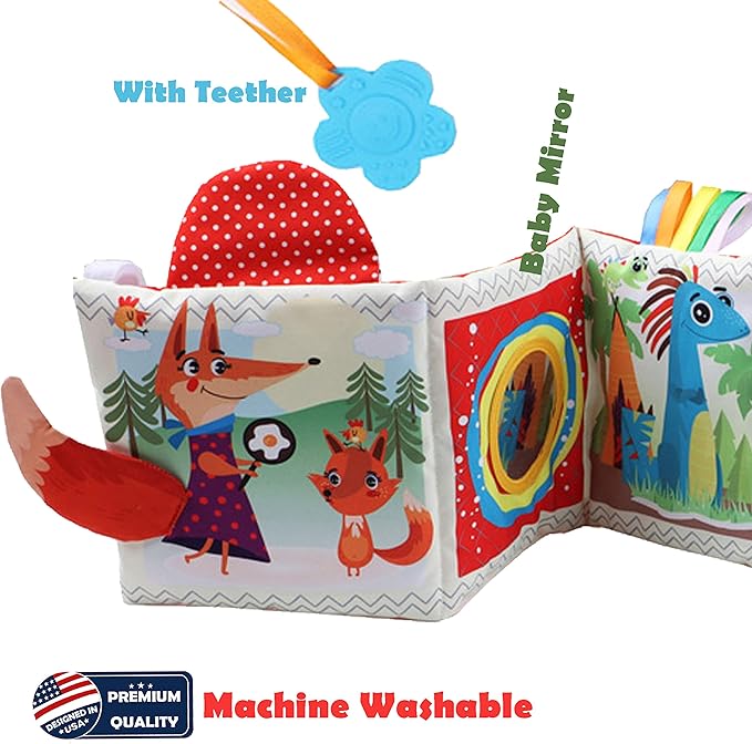 - EARLY DEVELOPMENTAL TOYS: This soft baby book features a baby-safe mirror that encourages self-discovery, an essential part of your baby’s development. The mirror can also be used as a baby crib mirror or baby car mirror interactive toy. The book includes a BPA-free teether toy that provides a gentle, soothing biting experience. It can be securely attached to cribs, play mats, or changing tables using the attached ribbons, making it perfect for tummy time play.