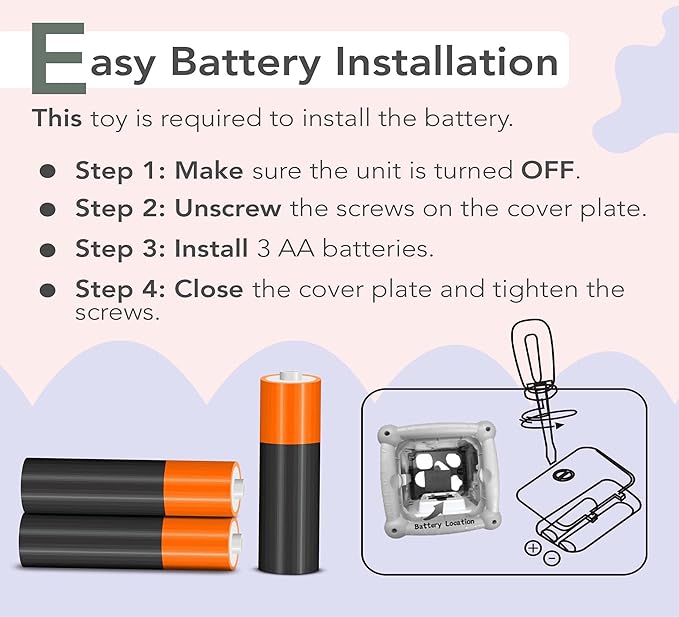 - 𝐁𝐚𝐭𝐭𝐞𝐫𝐲 𝐑𝐞𝐪𝐮𝐢𝐫𝐞𝐦𝐞𝐧𝐭: The Fast Learner baby activity cube requires 3 AA batteries (alkaline recommended) for optimal performance. To ensure safe play with the activity cube, avoid mixing battery types or using old and new batteries together. Remove batteries during extended periods of non-use, and handle rechargeable batteries with adult supervision.