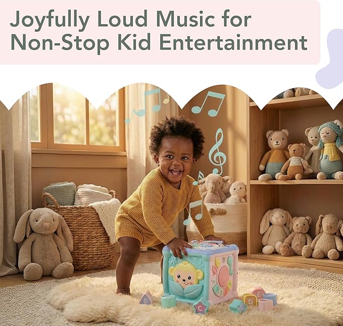 - 𝐈𝐧𝐭𝐞𝐫𝐚𝐜𝐭𝐢𝐯𝐞 𝐅𝐞𝐚𝐭𝐮𝐫𝐞𝐬 𝐟𝐨𝐫 𝐄𝐚𝐫𝐥𝐲 𝐋𝐞𝐚𝐫𝐧𝐢𝐧𝐠:This activity cube for babies introduces letters, animal names, and musical phrases through light-up buttons and sound. It also includes percussion play and a mushroom house for shape pairing, making it an ideal toys activity cube for active, skill-building fun.