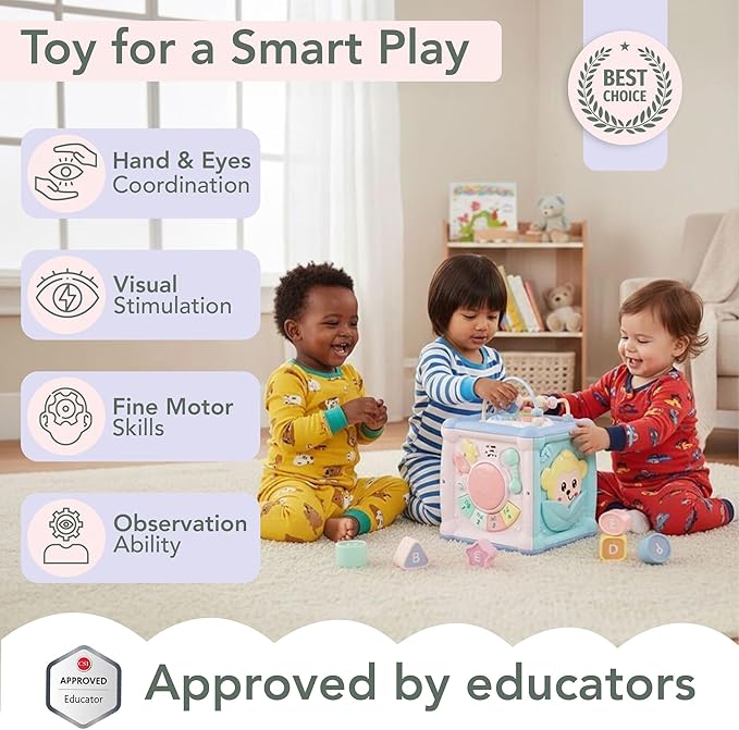 - 6-𝐢𝐧-𝟏 𝐅𝐮𝐧-𝐏𝐚𝐜𝐤𝐞𝐝 𝐋𝐞𝐚𝐫𝐧𝐢𝐧𝐠 𝐂𝐮𝐛𝐞:The activity cube features a bead maze, spinning gears, a flip board, a sliding track, and shape-sorting play: all designed to entertain and educate. With six interactive sides, this activity cube for toddlers promotes hands-on learning through music, lights, movement, and shape recognition.