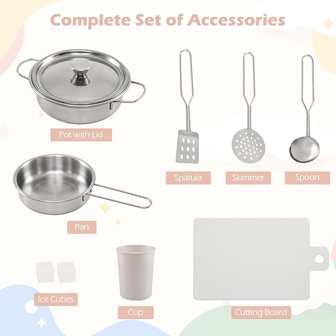 - Amazing for Little Chefs: The wooden corner kitchen set is packed with child-sized accessories – a spoon, skimmer, spatula, pot with lid, pan, ice cubes, cup, and cutting board. ASTM and CPSIA compliant, it is a reliable and safe for little ones aged 3+ years old, improving their cognitive ability, hands-on ability and social skills.