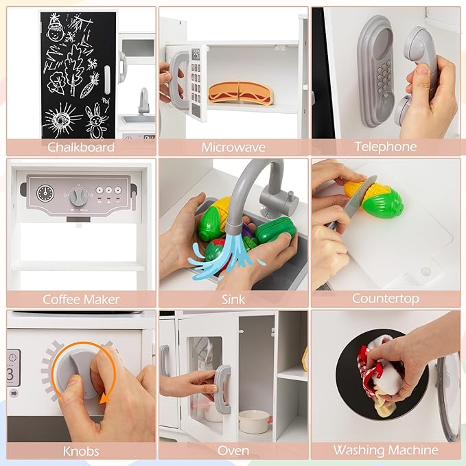 - Various Play Areas: The pretend kitchen playset is designed with a microwave, telephone, coffee maker, countertop, sink, oven and washing machine as more play options. The chalkboard invites kids to jot down the daily menu, encouraging their literacy and planning skills.