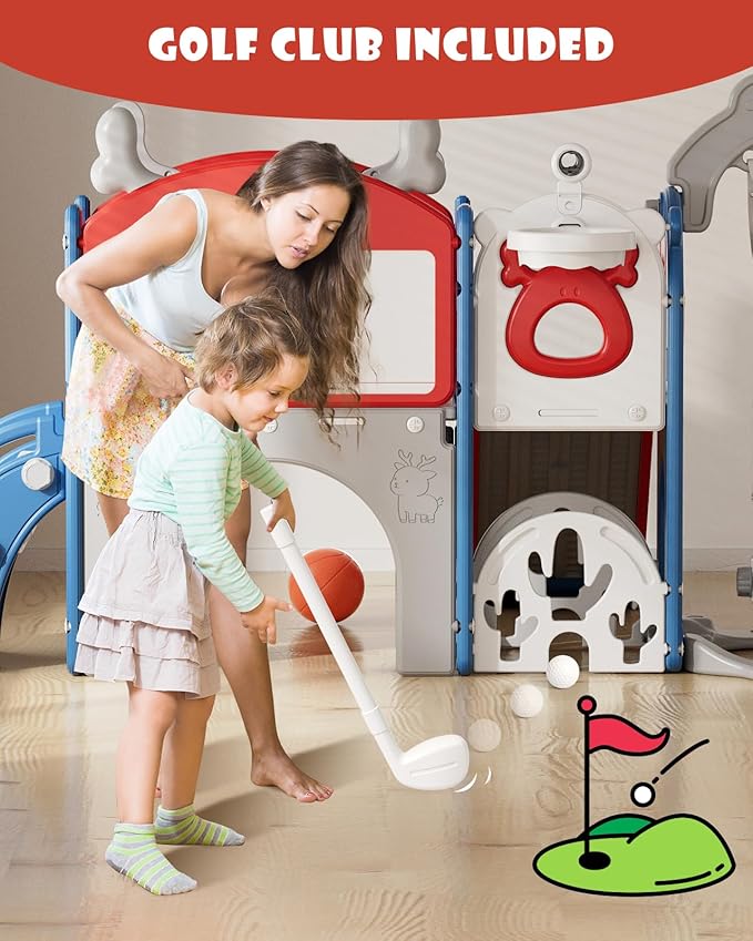 - 13-in-1 Toddler Playset: This playset includes a slide, a climber, a height-adjustable swing, a telescope, a drawing board, a crawl-through tunnel, a basketball hoop and a ball, elk antlers, a corridor, a steering wheel, hide-and-seek windows, and a storage space. Besides, it includes a newly launched golf set that is not available on other slides on the market, which enables you and your kids to play golf through this playset.