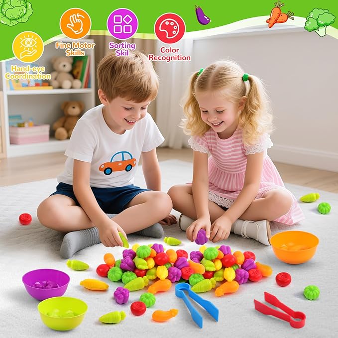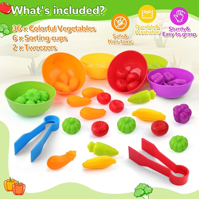 - 【Color Sorting Toys for Preschooler】There are 36 pcs vegetables toys including corn, carrots, eggplants, pumpkins, tomatoes, bell peppers. This set of sensory counting toys for toddlers also includes 6 rainbow color sorting bowls and 2 tweezers. The STEM educational tool are suitable for kids 3, 4, 5 years old and help them learn different colors, vegetables and early math. Through playing this lovely vegetable counters, toddlers can enhance their fine motor skills and hand-eye coordination.