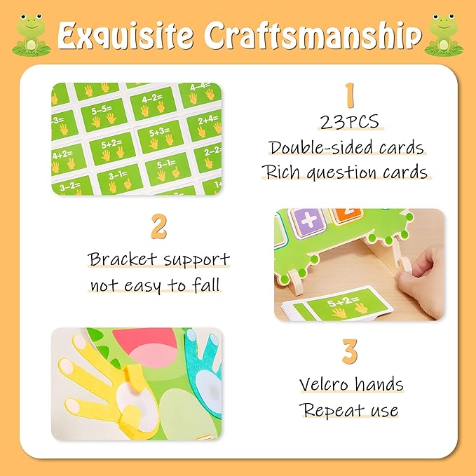 - 【Frog Interactive Math Games】 This adorable frog-themed counting toy combines playful design with early math education!Can better attract children's learning pleasure and interactionMath manipulatives game toys include 1 wooden finger board,12 colorful number blocks,23 athematical calculation card and a holder. Kids can match blocks to numbers, solve simple equations, or follow flashcard challenges making math visual, engaging fun!