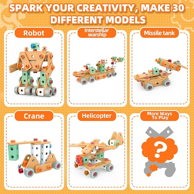 - EDUCATIONAL CONSTRUCTION TOYS FOR TODDLER: This pretend play kids toys is designed for boys and girls aged 3-6.Children can use a variety of tools to build 30 exquisite models,including robots, spaceships, tanks, helicopters,cranes, cars, motorcycles, bulldozers, puppies, elephants, and more.kids can choose the appropriate difficulty level based on their age and ability,from simple basic structures to complex mechanical models,allowing children to learn through play and grow through exploration