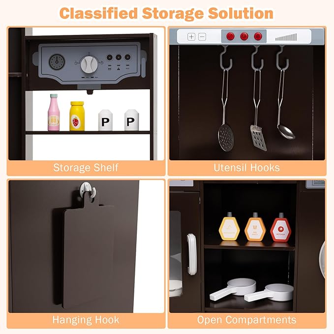 - Organized Storage Solutions: The kids corner kitchen set includes a storage shelf, utensil hooks, hanging hook, and open compartments. These thoughtfully designed storage solutions teach kids the importance of organization, encouraging them to keep their play area tidy and organized after play.