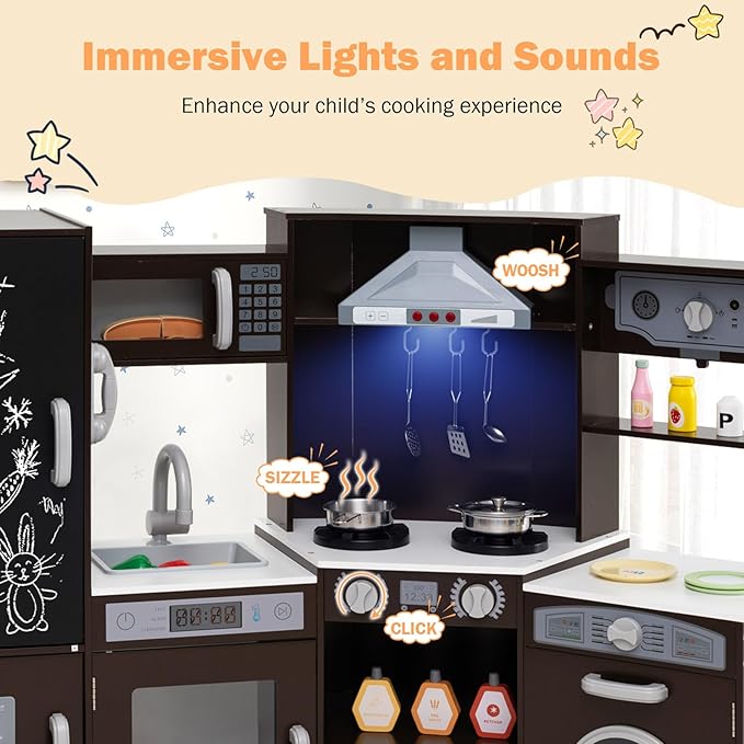 GLACER Corner Wooden Play Kitchen for Kids, Large Pretend Play Kitchen Playset with Sound, Light, Chalkboard, Microwave, Ice Maker, Washing Machine, Accessories, Toy Kitchen Set for Ages 3+ (Espresso)